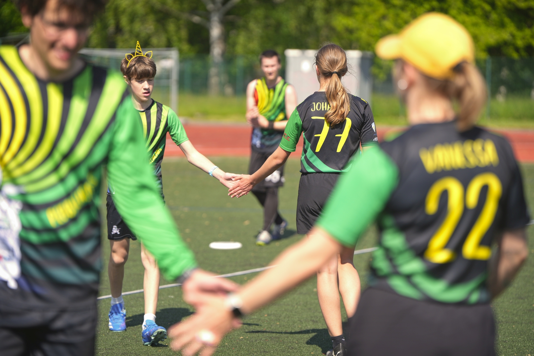 Wir als Legosteine, ein sehr altersdurchmischtes Team mit 5 Jugenspieler*innen, konnten uns gut im Turnierverlauf aufeinander einspielen! So erarbeiteten wir uns in der Poolphase Platz 3 von 7 und landeten damit zum Abschluss im Spiel um Platz 5. Dort wartete nach den air pussies (Berlin), Rotor aka Stahl Reichenhain (Berlin), Drehst'n Deckel (Dresden), Schleudertrauma (Magdeburg), der Thüringer Allgemeine und den Hallunken (Halle), DJ Dahlem (Berlin) auf uns. In diesem letzten, ausgeglichenen Spiel kippte das Momentum erst in der letzte Spielphase auf unsere Seite und wir konnte dir Punkte dabei schnell verwandeln.